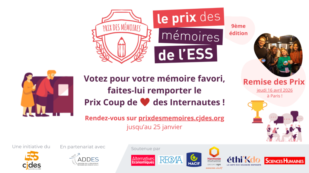 Présenté à la 9ᵉ édition du Prix des Mémoires de l’ESS, organisé par le CJDES en partenariat avec l’ADDES, récompensant chaque année des travaux de mémoire (L3, M1 ou M2, en formation initiale ou continue) portant sur un enjeu lié à l’Économie Sociale et Solidaire.